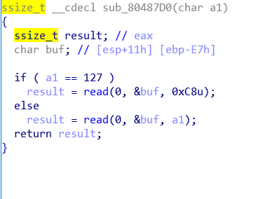 而另一个函数sub_80487D0中a1就是main函数中传入的v5,buf的地址为[ebp-E7],如果v5为127,则会执行第一条代码,C8<E7,不能覆盖返回地址,v5需要尽可能的大,才能覆盖到返回地址。